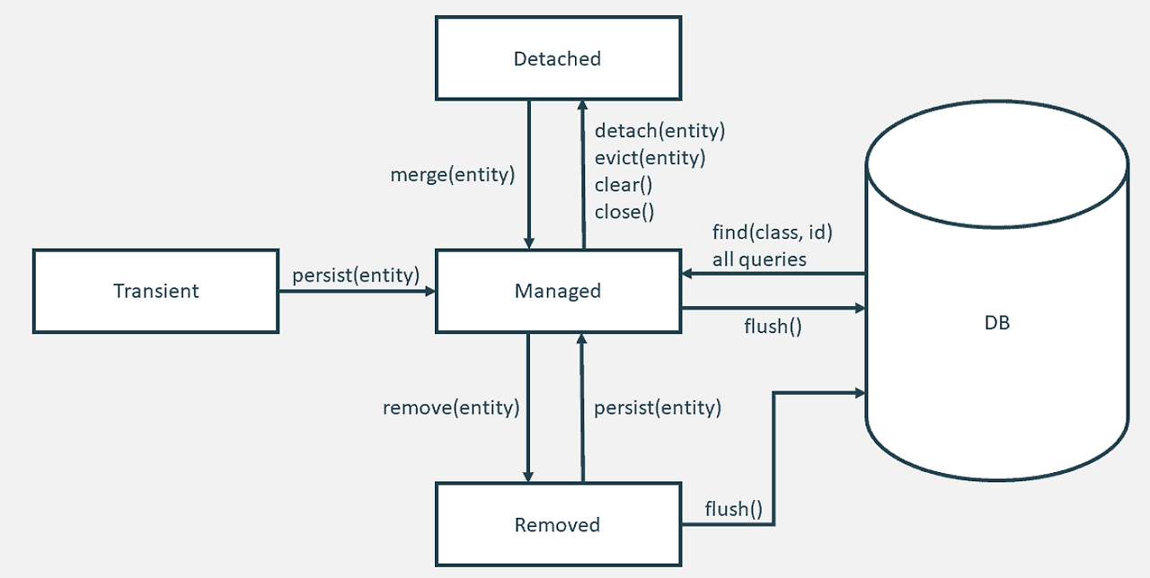 - 준영속 상태: 영속성 컨텍스트에서 분리된 엔티티의 상태입니다. 더 이상 영속성 컨텍스트에 의해 관리되지 않습니다.