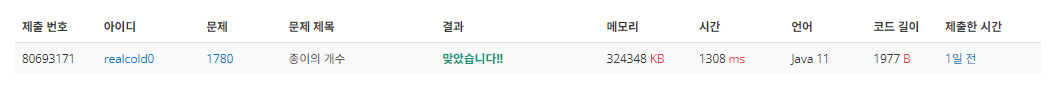 또한 예제를 보면 1칸 단위까지 들어가므로 size가 1이 되면 해당 값을 카운트에 올려주어야한다.